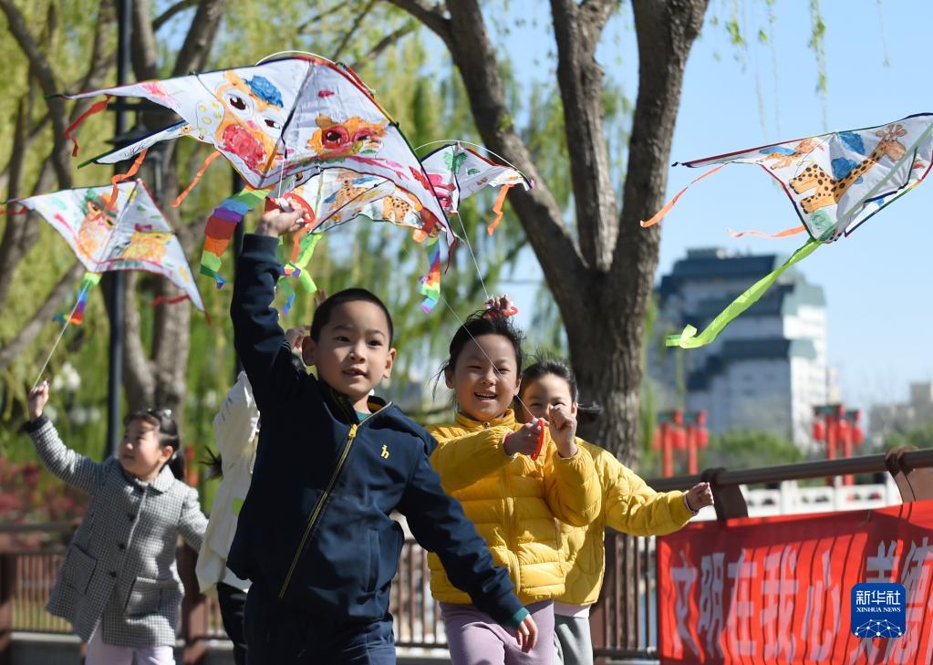 4月7日,小朋友在北京陶然亭公園放風箏。