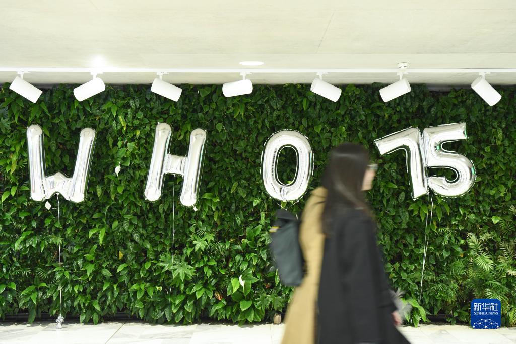 4月6日,在瑞士日內瓦世界衛生組織總部,工作人員走過慶祝世衛組織成立75周年的裝飾墻。