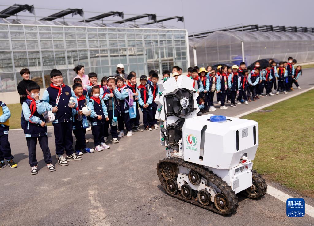 4月7日,在位于浙江省桐鄉(xiāng)市石門鎮(zhèn)的桐信種苗“未來(lái)農(nóng)場(chǎng)”,開(kāi)展研學(xué)活動(dòng)的小學(xué)生觀看農(nóng)場(chǎng)研發(fā)的植保機(jī)器人。