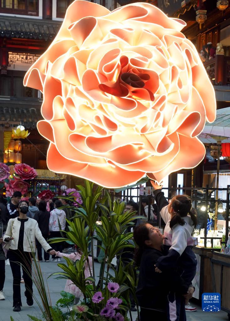 4月7日在豫園商城內拍攝的巨型花朵裝置。