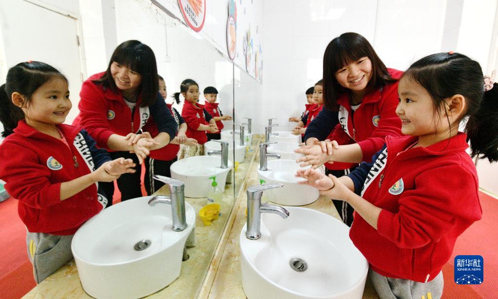 4月7日,在河北省石家莊市欒城區第一幼兒園,小朋友在老師指導下學習“七步洗手法”。