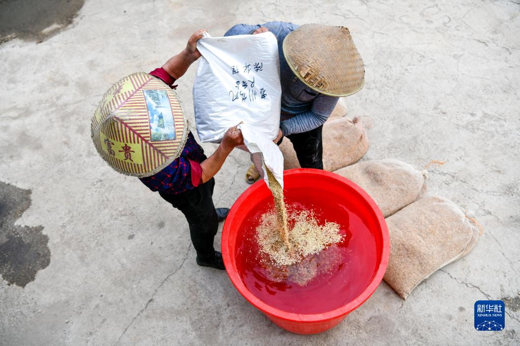 4月6日,貴州省岑鞏縣水尾鎮一雜交水稻種植大戶在浸泡稻種,為雜交水稻育苗做準備。