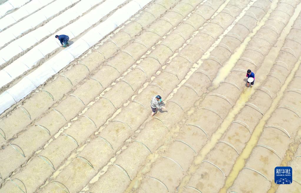 4月7日,村民在貴州省岑鞏縣天馬鎮天馬村雜交水稻制種基地勞作(無人機照片)。