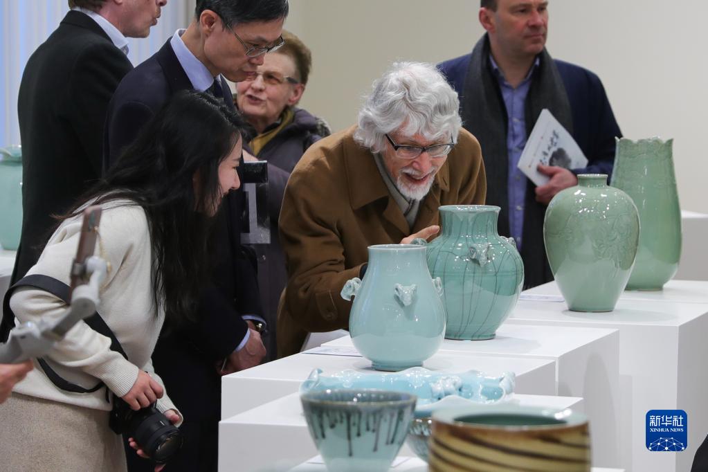 4月3日,在比利時布魯塞爾,參觀者在“聽瓷語 觀世界——宋韻龍泉青瓷展”上觀賞瓷器。