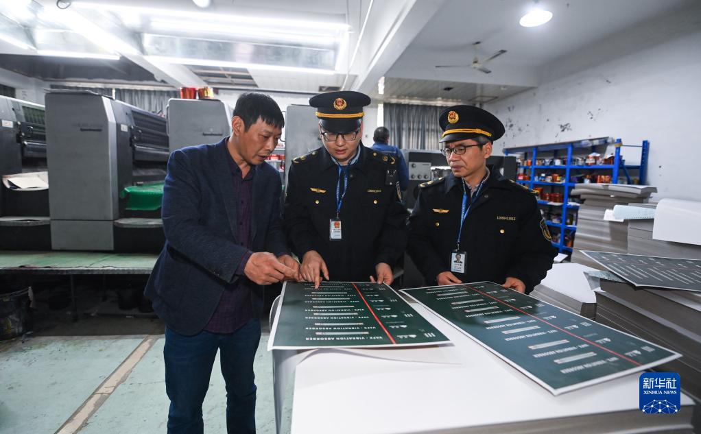4月7日,諸暨市文化市場行政執法隊的工作人員在檢查印刷企業印刷品內容是否規范。