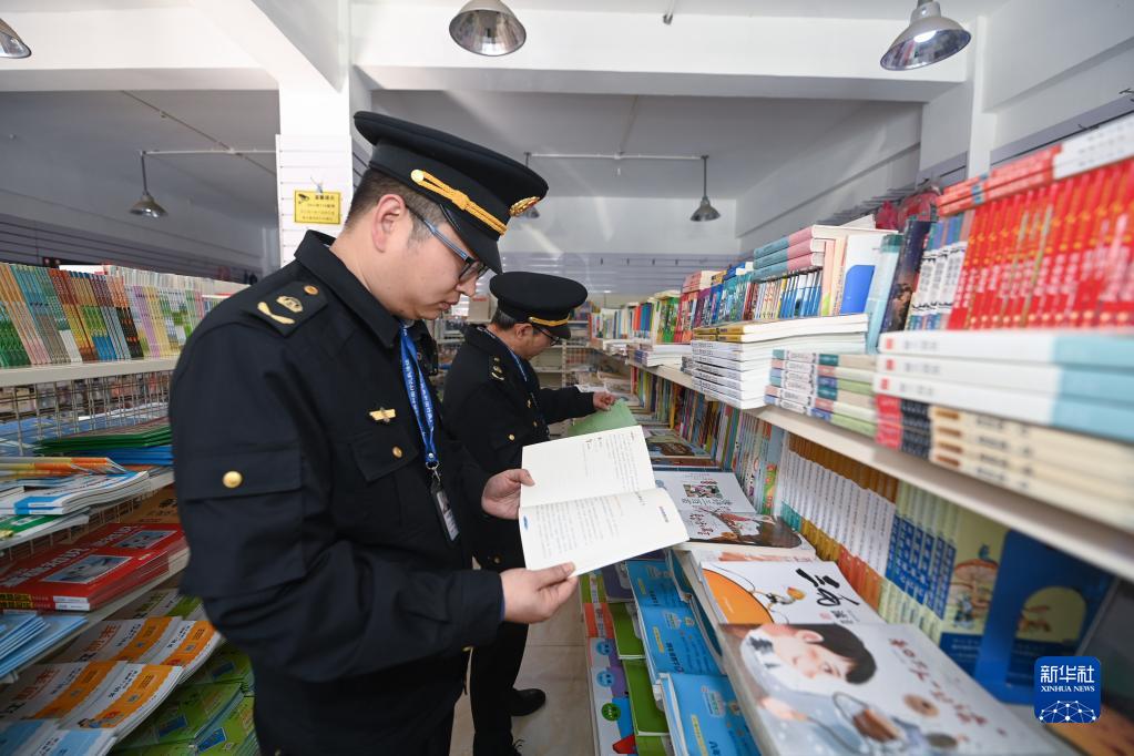 4月7日,諸暨市文化市場行政執法隊的工作人員在校園周邊書店檢查教輔類出版物經營情況。