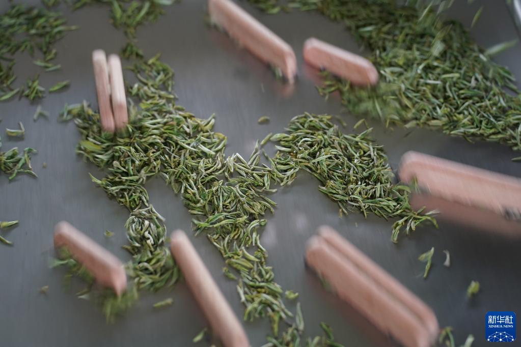 漢中市南鄭區青樹鎮一家茶企生產線上加工的茶葉(4月5日攝)。