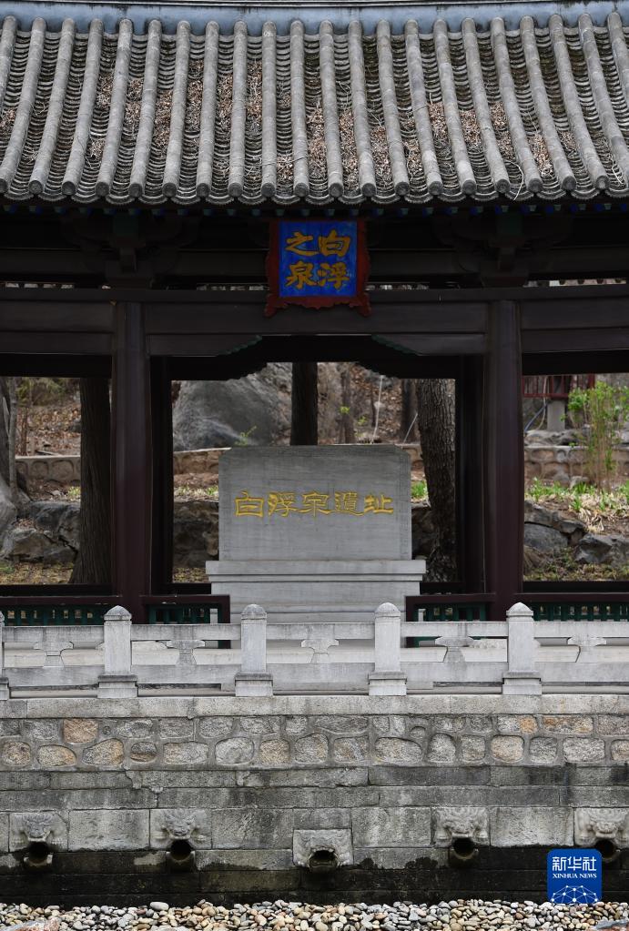 這是4月6日在位于北京市昌平區的大運河源頭遺址公園里拍攝的“白浮之泉”碑亭和九龍池。