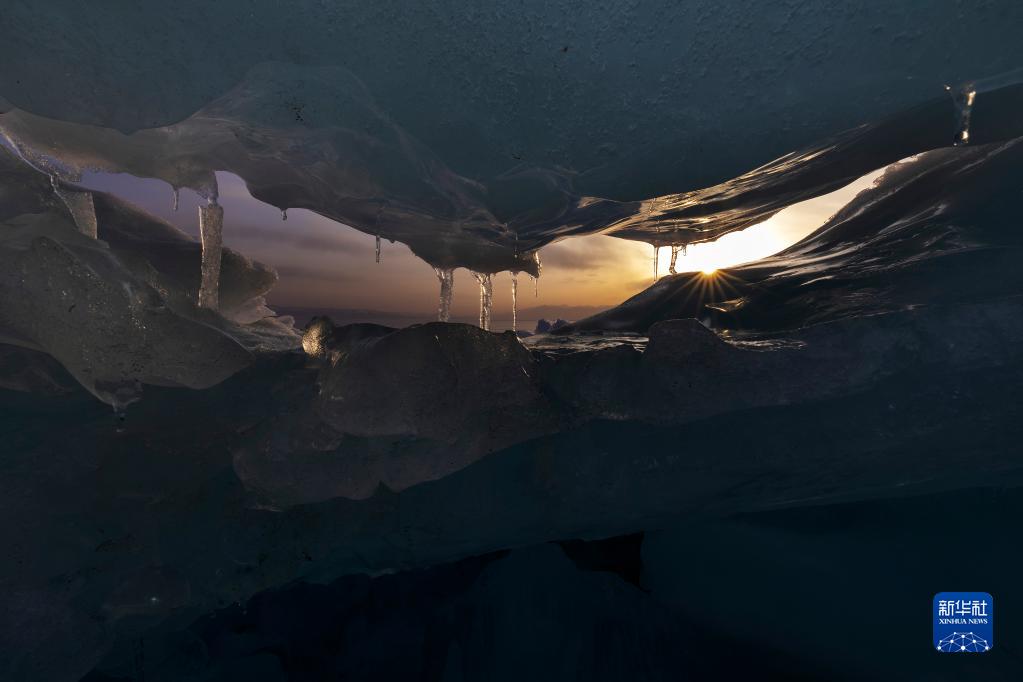 4月6日,賽里木湖畔的冰推在夕陽下散發著光芒。