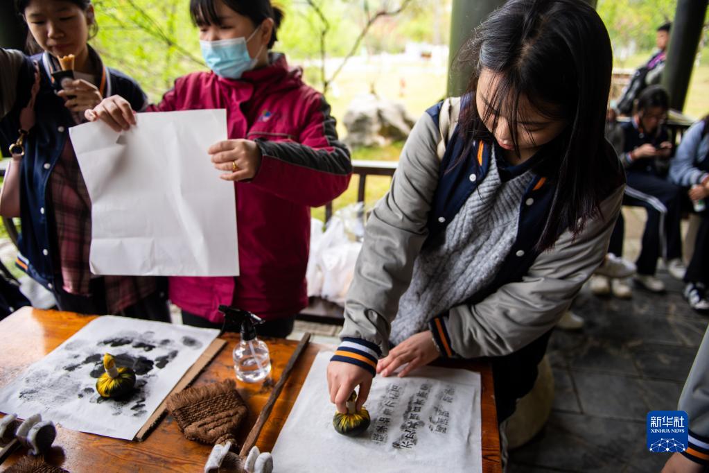 4月8日,游客在常德桃花源風景名勝區體驗拓印。