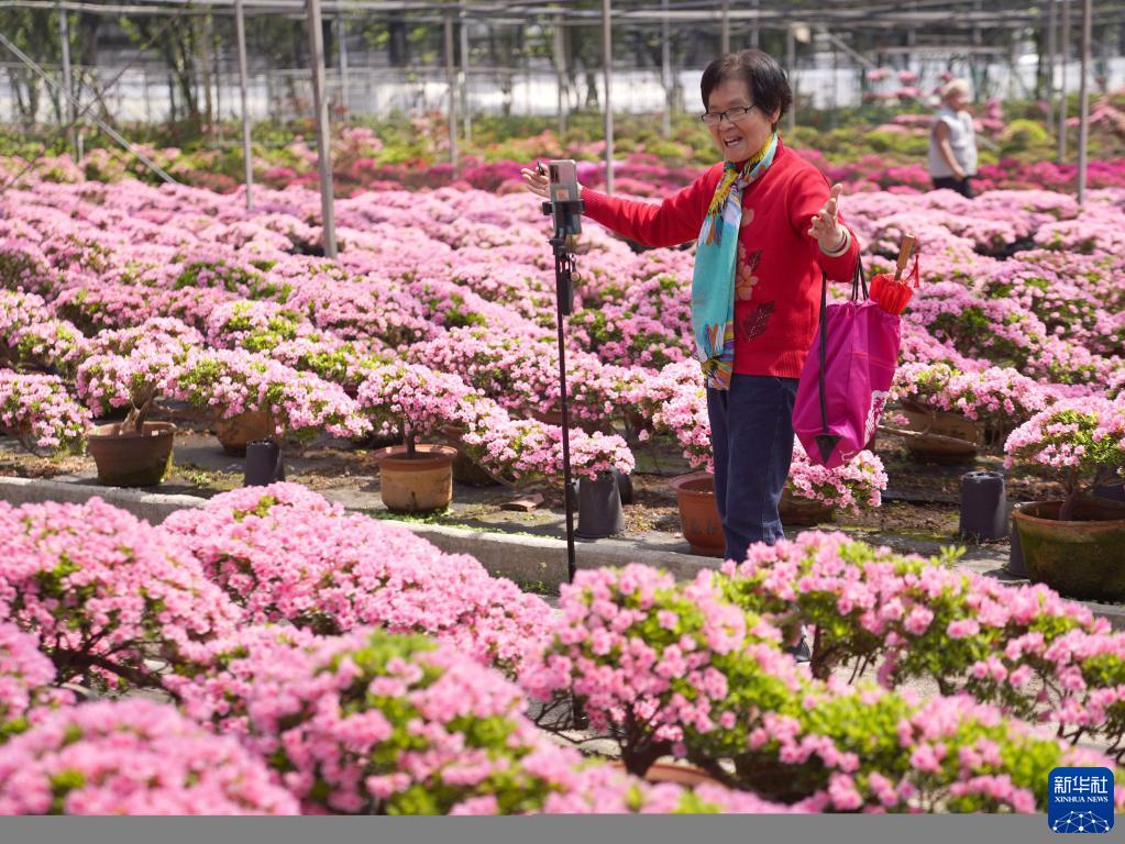 4月8日,嘉善縣82歲的抖音愛好者胡品文在大云鎮碧云花園直播杜鵑花。