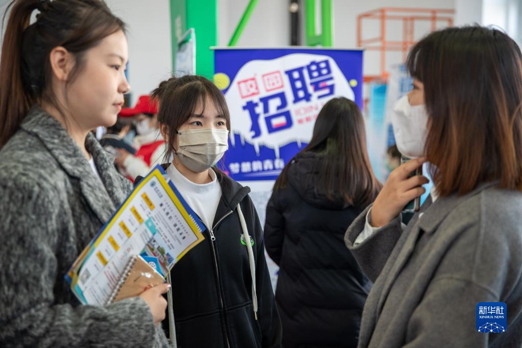 4月8日,在黑龍江工商學院松北校區體育館,求職者與用人單位工作人員交談。