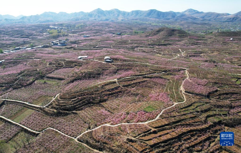 4月8日在河北省保定市順平縣臺魚鄉(xiāng)寨子村拍攝的桃園景色(無人機照片)。