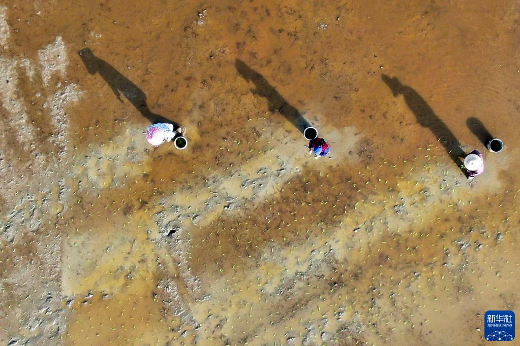 4月8日,江西省吉安市峽江縣水邊鎮(zhèn)義橋村的農(nóng)民在田間拋秧(無(wú)人機(jī)照片)。