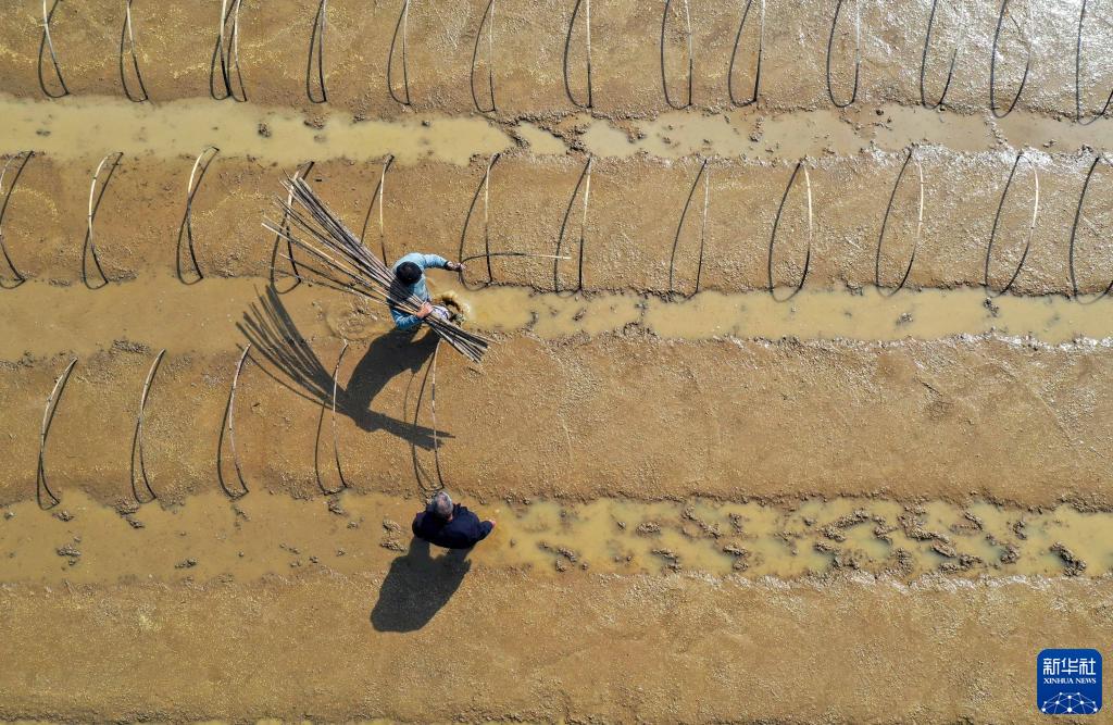 4月8日,村民在貴州省岑鞏縣天星鄉東興村雜交水稻制種基地搭建膜棚(無人機照片)。
