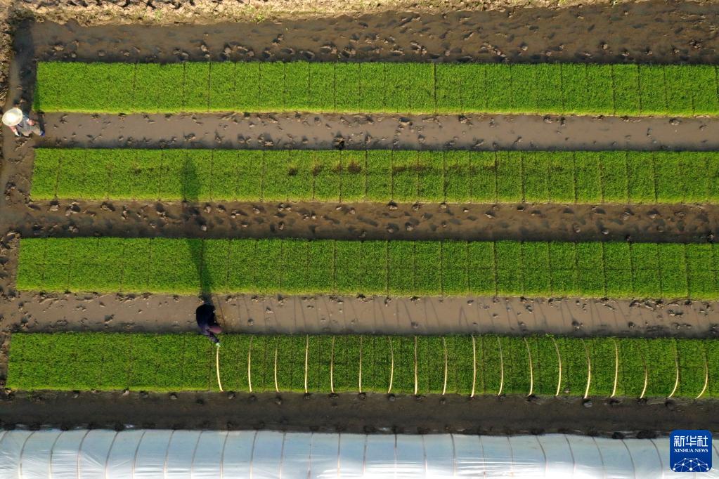 4月8日,在四川省眉山市東坡區永豐村,社員在育秧基地忙碌(無人機照片)。