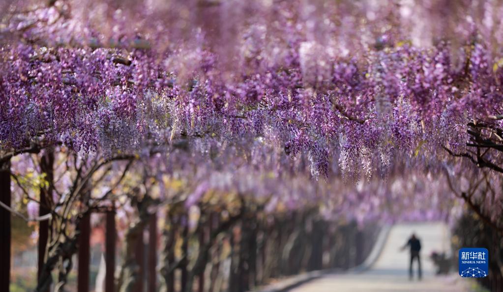 4月8日,游客在江蘇省句容市后白鎮紫藤長廊下賞花休閑。