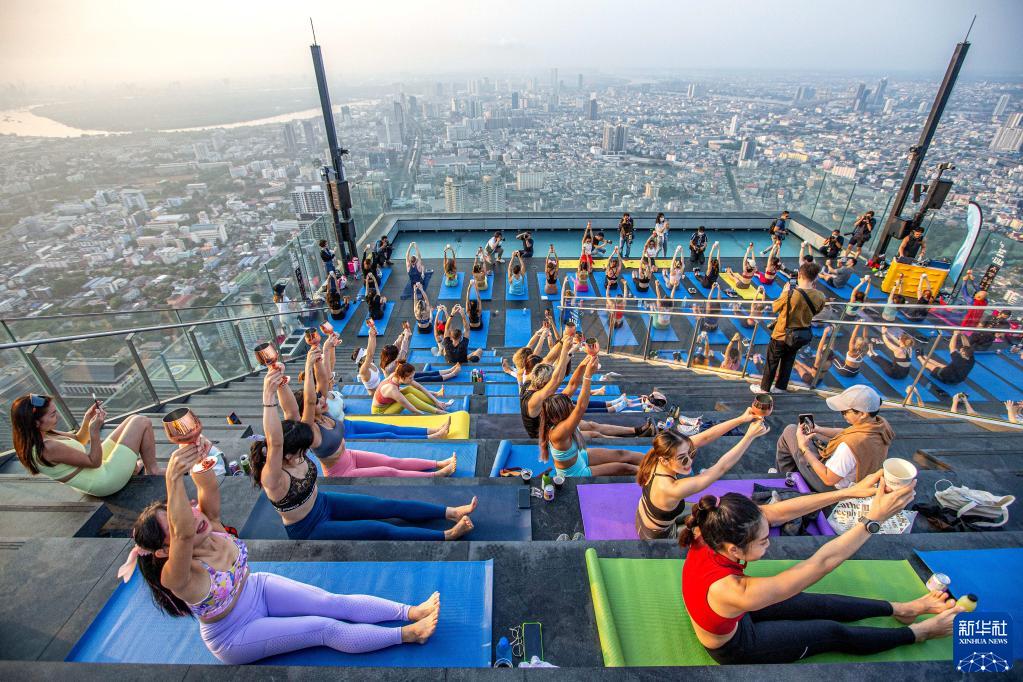 當日,數十名瑜伽愛好者在曼谷王權云頂大廈頂層觀景平臺體驗高空瑜伽。