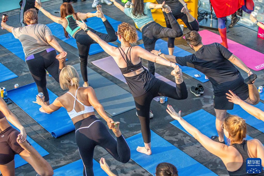 當日,數十名瑜伽愛好者在曼谷王權云頂大廈頂層觀景平臺體驗高空瑜伽。