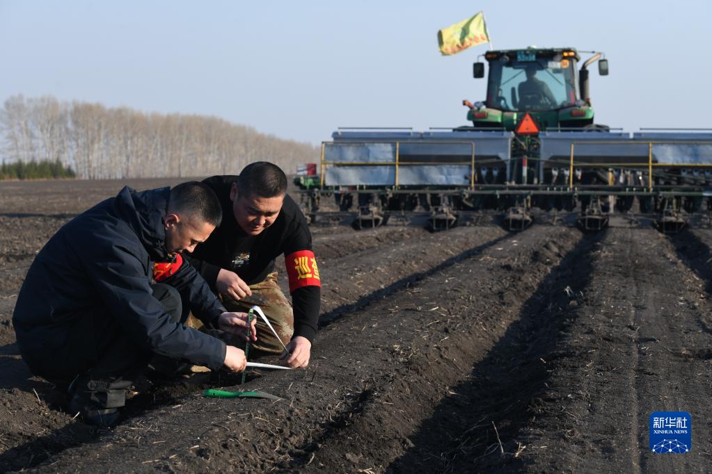 4月8日,在位于黑龍江省北安市的北大荒集團建設農場有限公司第四管理區一處農田,農業技術員在監測施肥作業質量。
