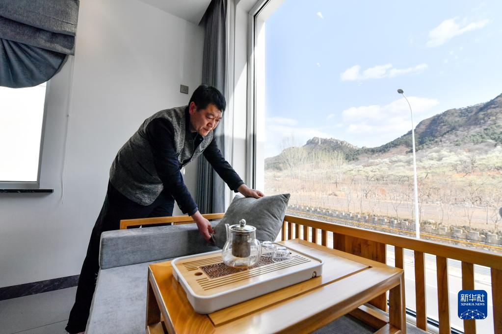 4月6日,在天津市薊州區(qū)下營鎮(zhèn)團山子村,民宿經(jīng)營者收拾房間準備迎客。