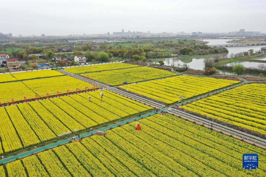 游客在浙江省湖州市吳興區八里店鎮移沿山生態景區的油菜花海游玩(2023年3月25日攝,無人機照片)。
