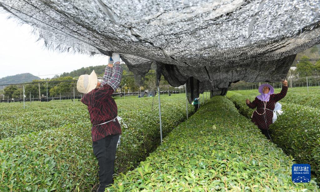 在浙江省紹興市越城區(qū)富盛鎮(zhèn)抹茶生產(chǎn)基地,農(nóng)戶為茶樹拉遮陽網(wǎng)(2月28日攝)。當(dāng)?shù)赝ㄟ^引入抹茶生產(chǎn)技術(shù)發(fā)展抹茶產(chǎn)業(yè),目前成為國(guó)內(nèi)較大的抹茶原料供應(yīng)基地。