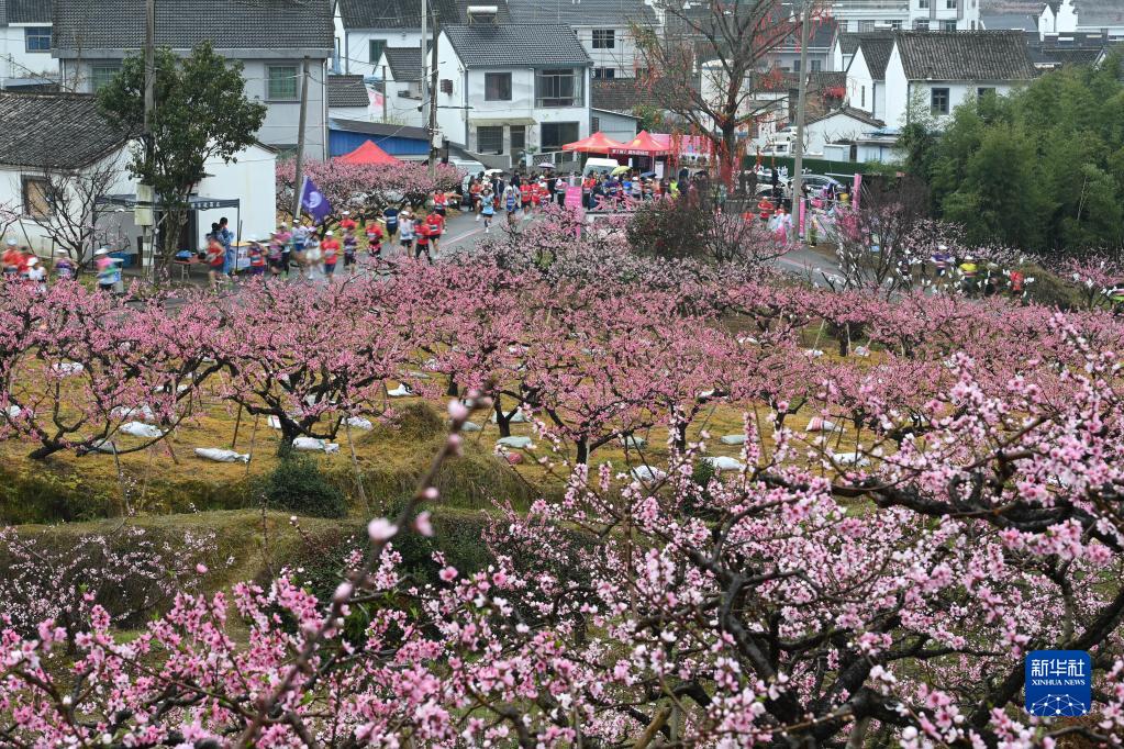 參加馬拉松比賽的選手經過浙江省寧波市奉化區蕭王廟街道林家村的一片桃園(2023年3月19日攝)。