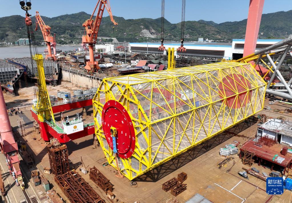 4月9日在馬尾造船股份有限公司總組場地拍攝的“乾動2號”深遠海養殖平臺(無人機照片)。
