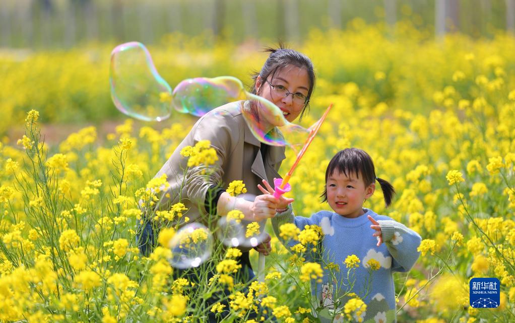 4月9日,家長帶著孩子在山東省滕州市洪緒鎮一處油菜花田里玩耍。