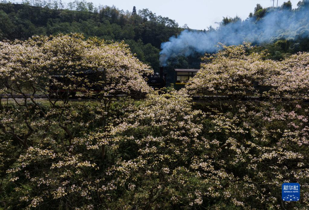 4月9日,一列嘉陽小火車經(jīng)過亮水沱站的桐子花叢(無人機照片)。
