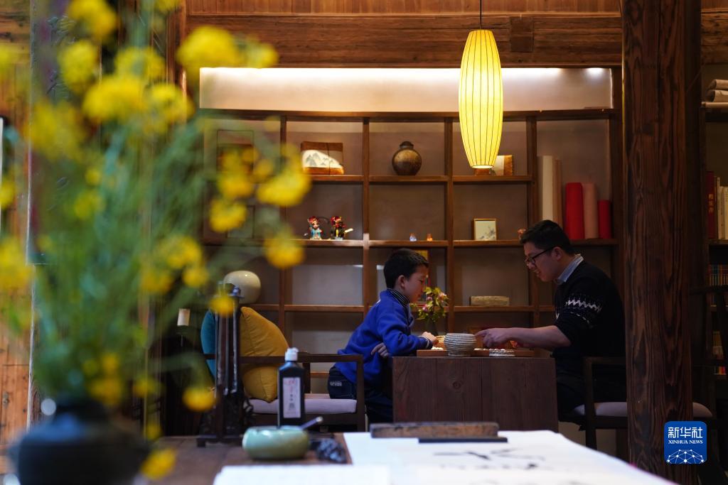 4月9日,在黟縣碧陽鎮石亭村的民宿拾庭畫驛,一對父子在下棋。