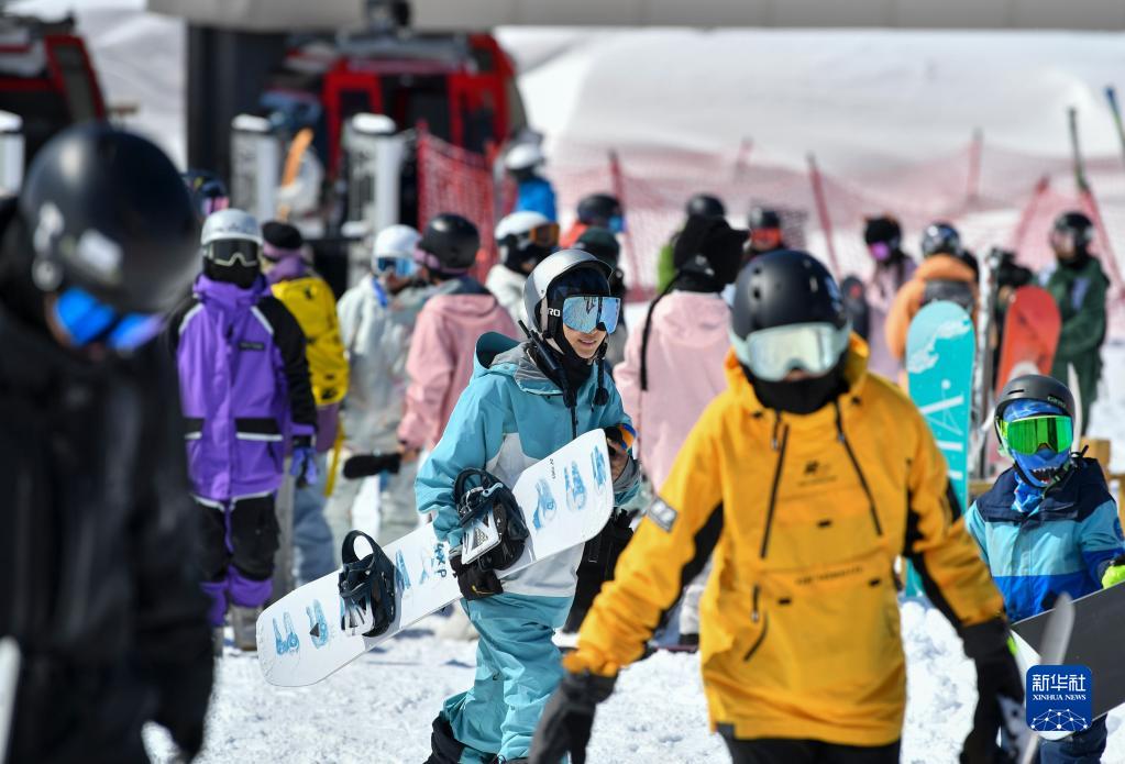 滑雪愛好者走在新疆富蘊縣可可托海國際滑雪度假區內(4月9日攝)。