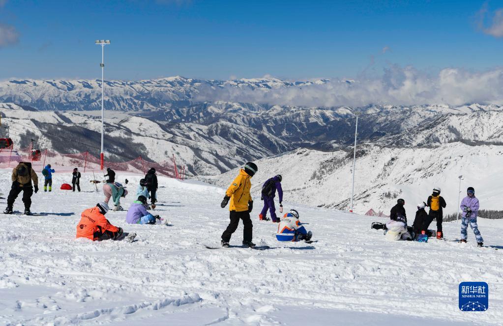 游客在新疆富蘊縣可可托海國際滑雪度假區(qū)滑雪游玩(4月9日攝)。
