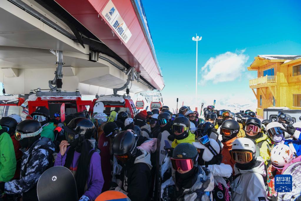 游客在新疆富蘊(yùn)縣可可托海國(guó)際滑雪度假區(qū)排隊(duì)等候乘坐纜車(4月9日攝)。