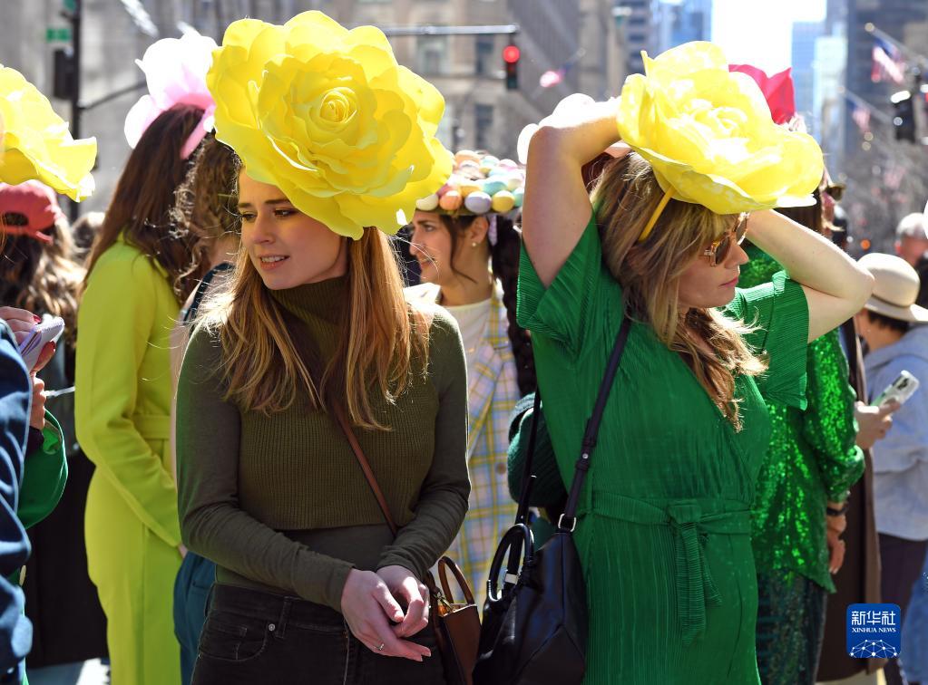 當日是西方傳統節日復活節,人們頭戴精心制作的花帽,在紐約第五大道參加一年一度的復活節游行。