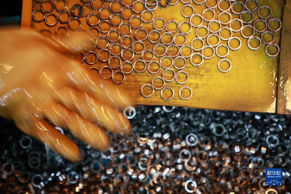 4月10日,搬遷群眾在獨山縣望城社區安置點附近的軸承產業園區內給軸承涂抹潤滑油。