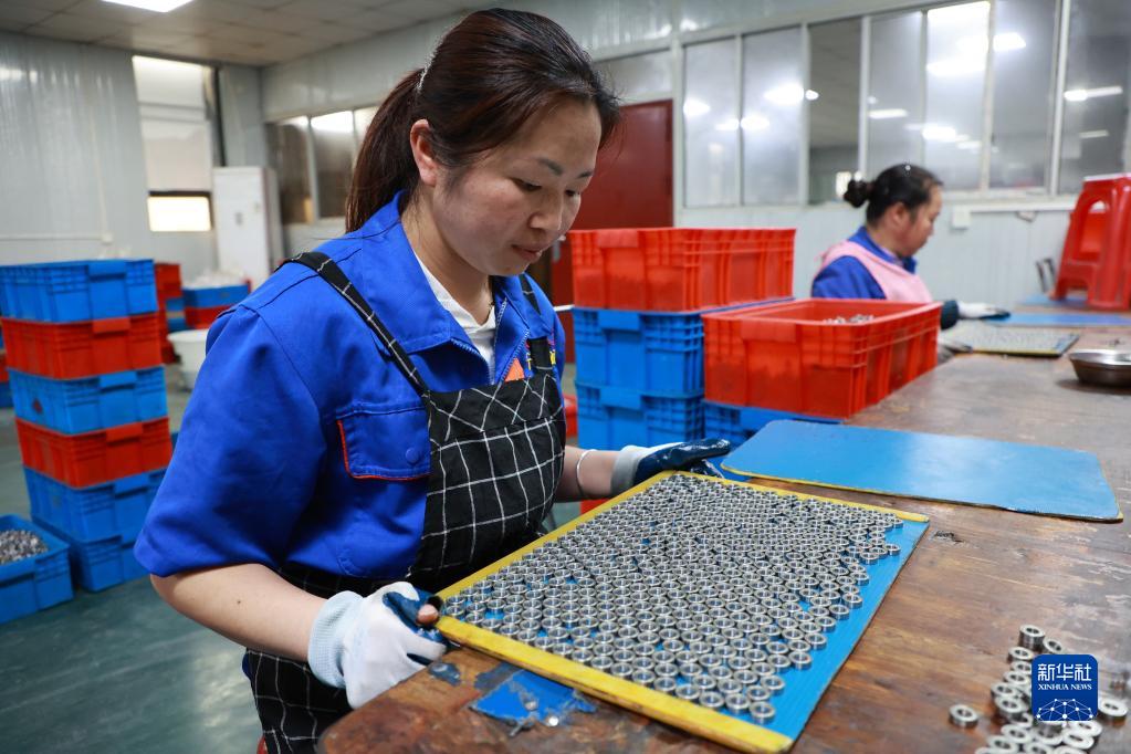 4月10日,搬遷群眾在獨山縣望城社區安置點附近的軸承產業園區內檢查成品軸承質量。