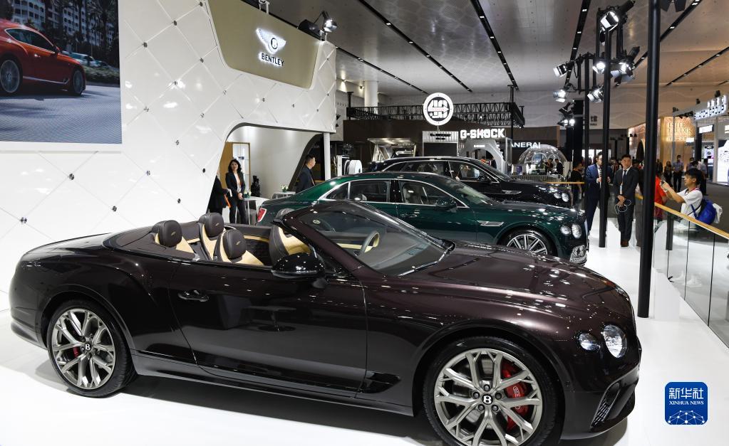 4月10日,觀眾在第三屆消博會現場參觀展出的賓利汽車。