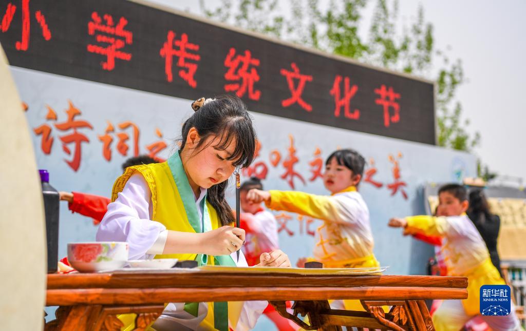當日,以“徜徉詩詞之海,品味文韻之美”為主題的傳統文化節在天津小學舉行。學生們在老師的指導下參與國學朗誦、京劇選段表演、書畫展示等活動,感受傳統文化的魅力。