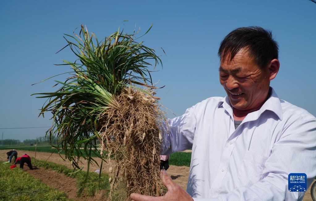 4月10日,在山東省單縣高老家鄉,一名麥冬種植戶在查看麥冬長勢。