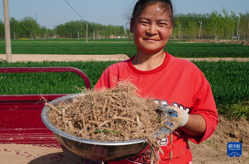 4月10日,在山東省單縣高老家鄉,一名麥冬種植戶在展示剛收獲的麥冬。