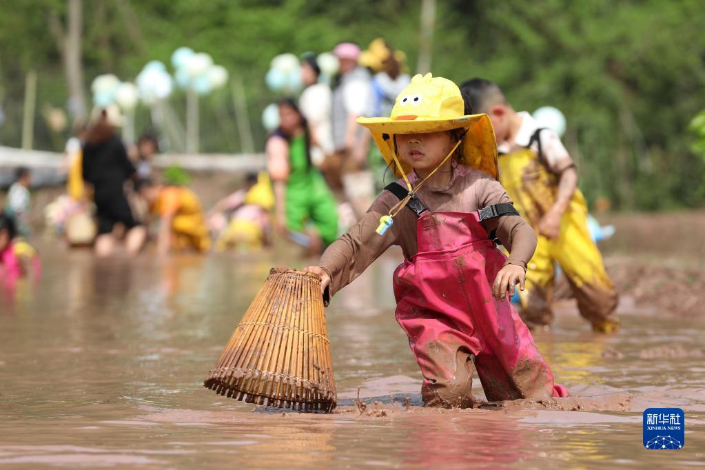 4月10日,四川省廣安市武勝縣東方紅幼兒園的小朋友在龍女鎮(zhèn)的稻田里抓魚。