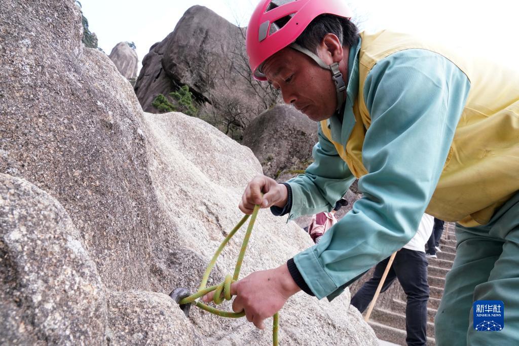 在安徽黃山風景區,有這樣一群特殊的環衛工,他們常年攀爬在懸崖峭壁間清理垃圾。玉屏環衛所的李培生是他們中的一員,20多年來,李培生累計放繩長度達1800公里,除了巡查并清理垃圾,還經常幫助游客撿拾掉下懸崖的物品,2012年被評為“中國好人”。黃山風景區一共有18名像李培生這樣的放繩工,他們用辛勤的汗水守護著黃山的美麗。