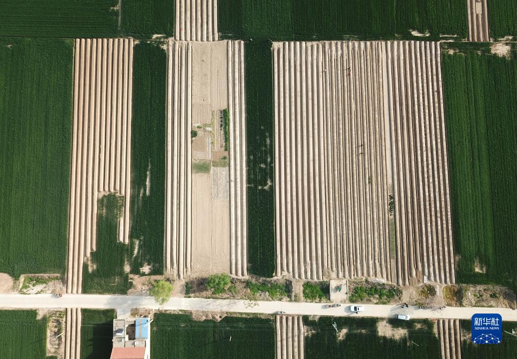 4月10日,在山東省單縣高老家鄉,村民在蘆筍種植田收獲蘆筍(無人機照片)。