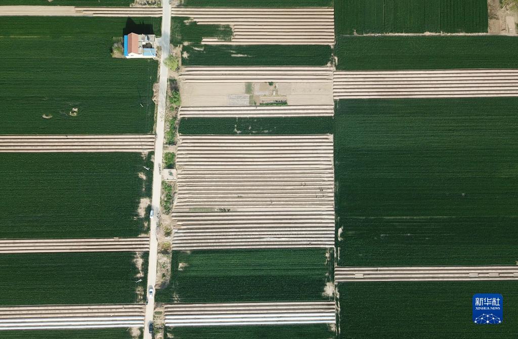 4月10日,在山東省單縣高老家鄉,村民在蘆筍種植田收獲蘆筍(無人機照片)。