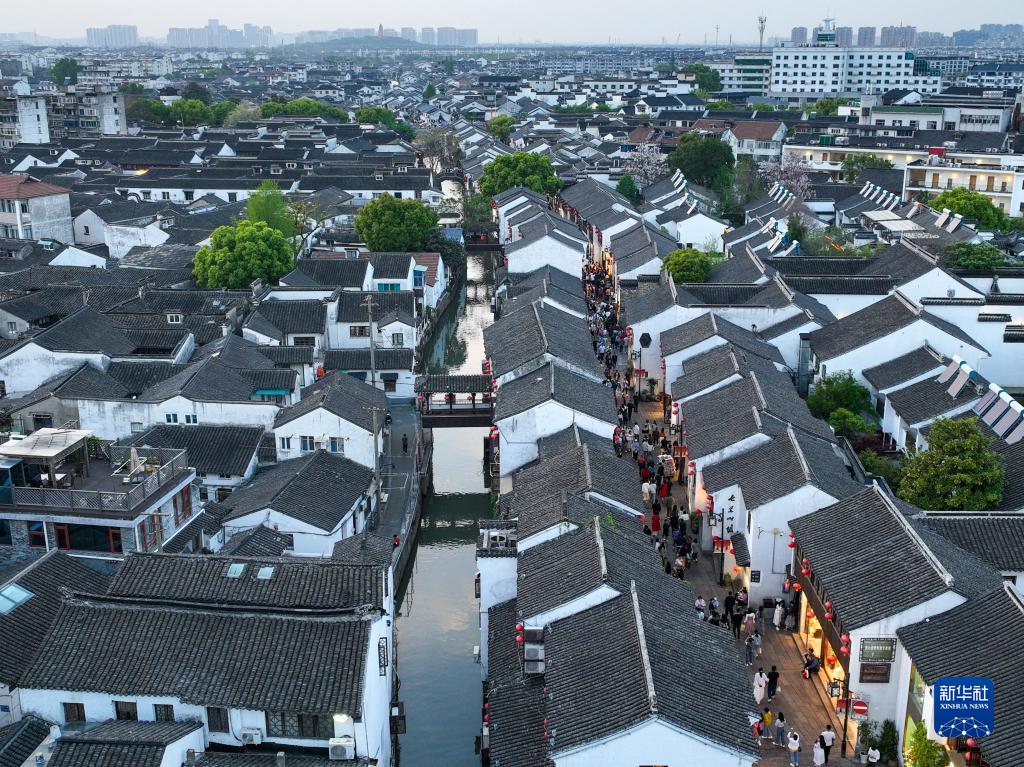 游客在江蘇蘇州山塘街休閑游玩(4月10日攝,無人機照片)。
