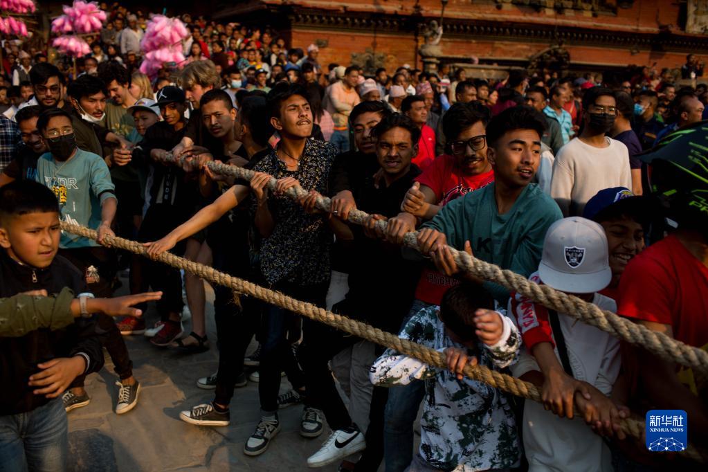 4月10日,在尼泊爾中部加德滿都谷地的巴克塔普爾,參加新年慶典的人們在傳統(tǒng)的慶?;顒由虾狭ν献Ь薮蟮纳裣駪?zhàn)車。