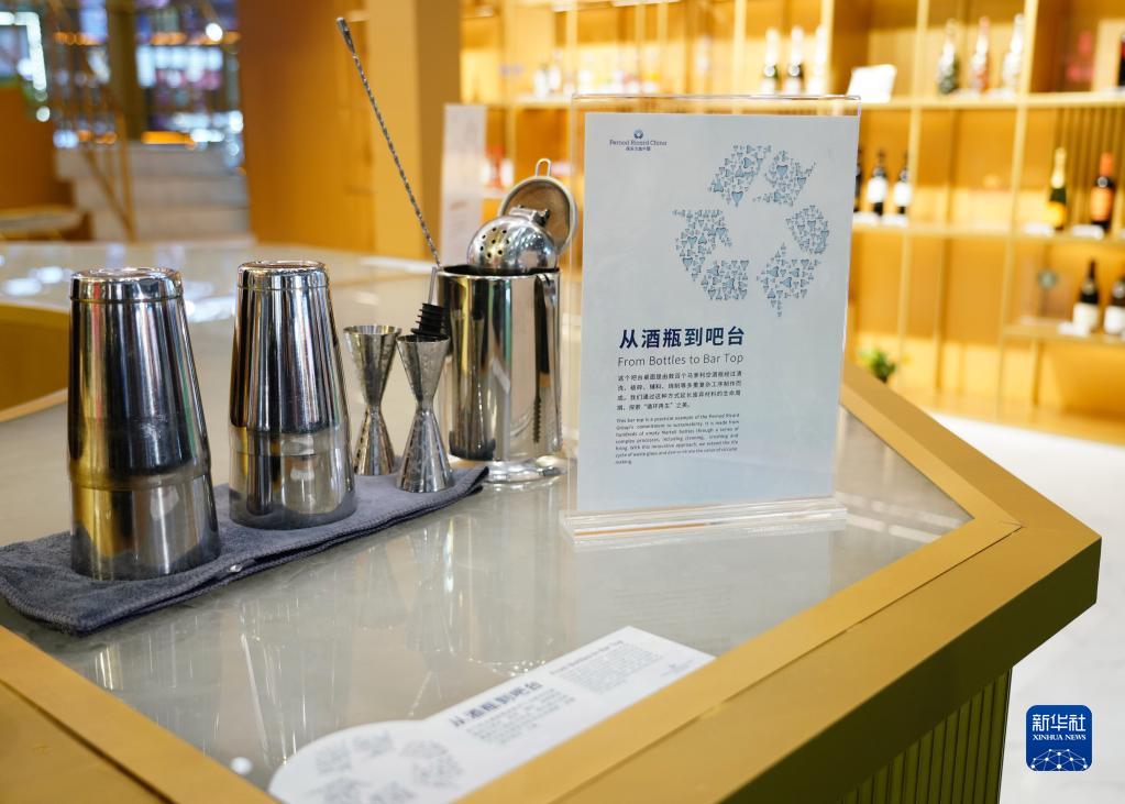 這是保樂力加中國展臺展示的由廢棄空酒瓶制作的循環再生吧臺(4月10日攝)。