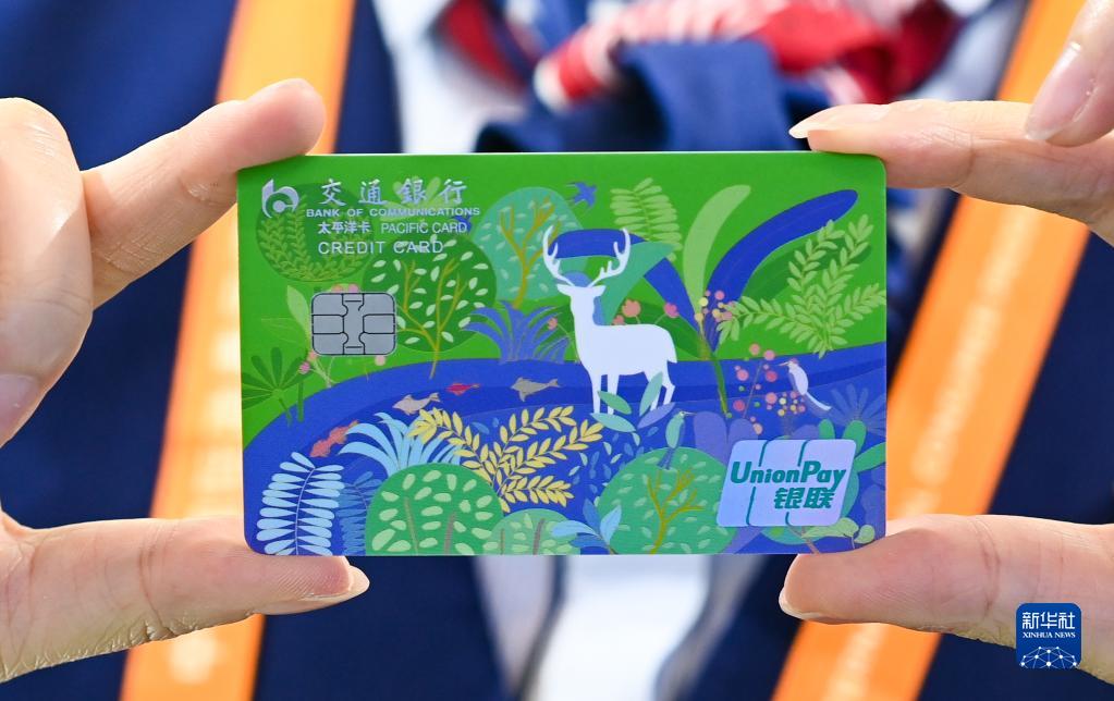 交通銀行工作人員展示交通銀行綠色低碳主題信用卡,該產(chǎn)品卡面使用了可降解的環(huán)??ɑ?月10日攝)。